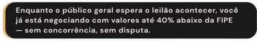 Acesso exclusivo a 160+ veículos diariamente com laudo cautelar completo, 20+ fotos detalhadas e retirada em 70+ pátios pelo Brasil.